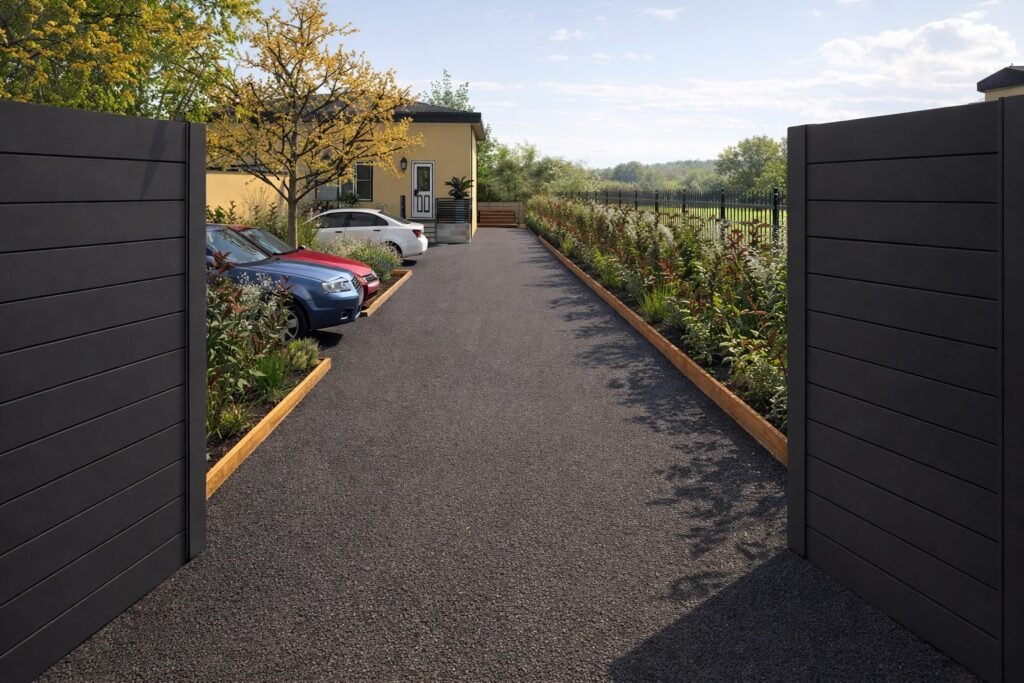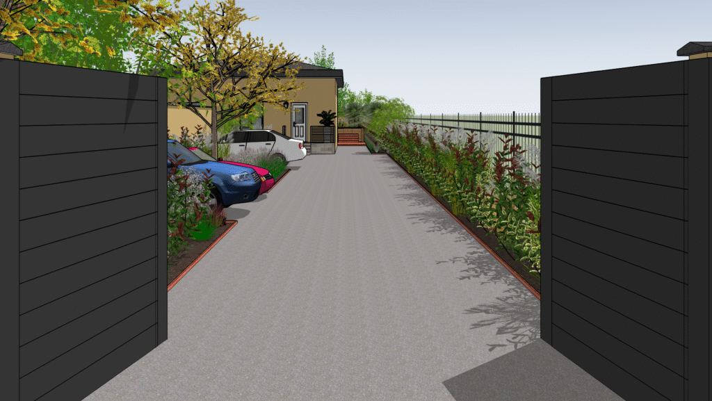 - Mise en valeur de la longueur de la parcelle par la création d’un cheminement fluide et structurant en gravier concassé sur plaques alvéolées assurant une circulation stable et lisible