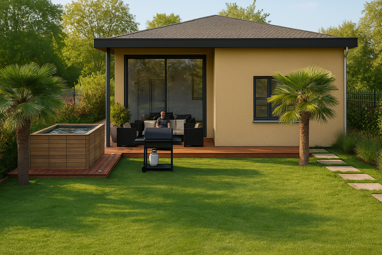 - Aménagement d’une terrasse arrière en bois exotique, le Padouk, choisi pour sa robustesse et sa durabilité naturelle, offrant un espace de détente chaleureux et convivial intégrant un emplacement dédié à l’installation d’un jacuzzi.