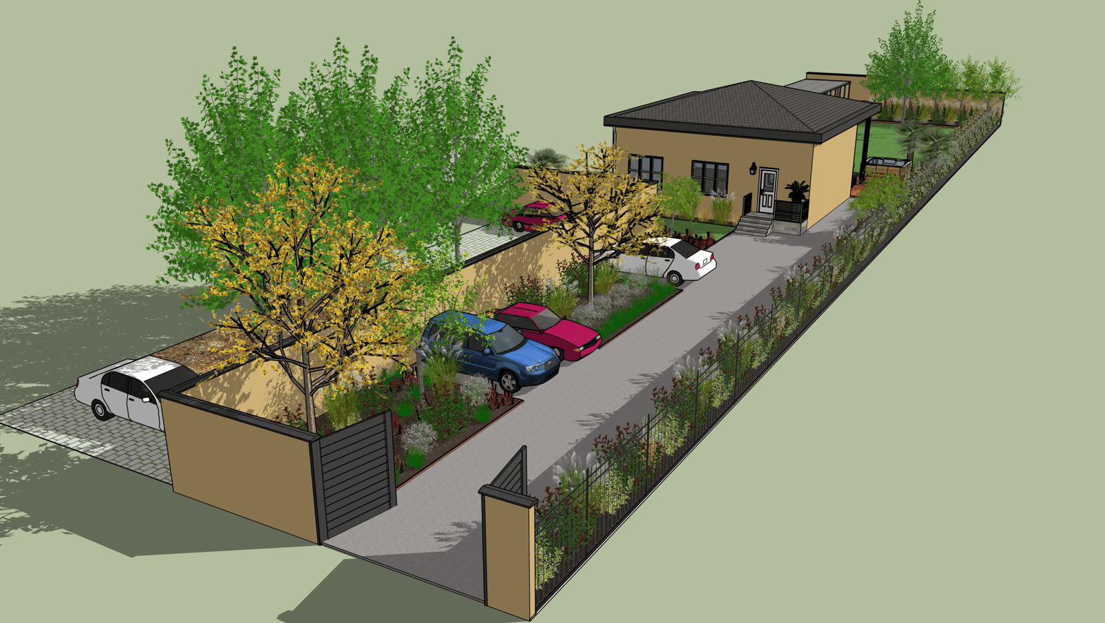 Souhaits des jeunes propriétaires : concevoir un aménagement global et cohérent de l’ensemble de la parcelle, intégrer des espaces de stationnement le long de la servitude structuré par la plantation de massifs végétalisés, aménager le jardin arrière comme un espace dédié à la détente et à la convivialité, incluant l’installation d’un jacuzzi et la mise en place de zones destinées à une production alimentaire autonome, comprenant un potager et un poulailler.