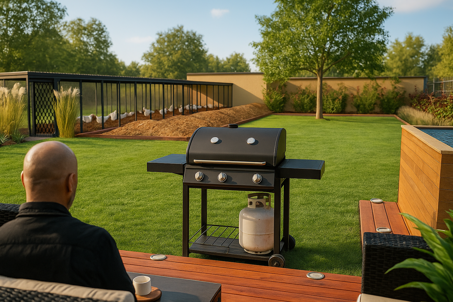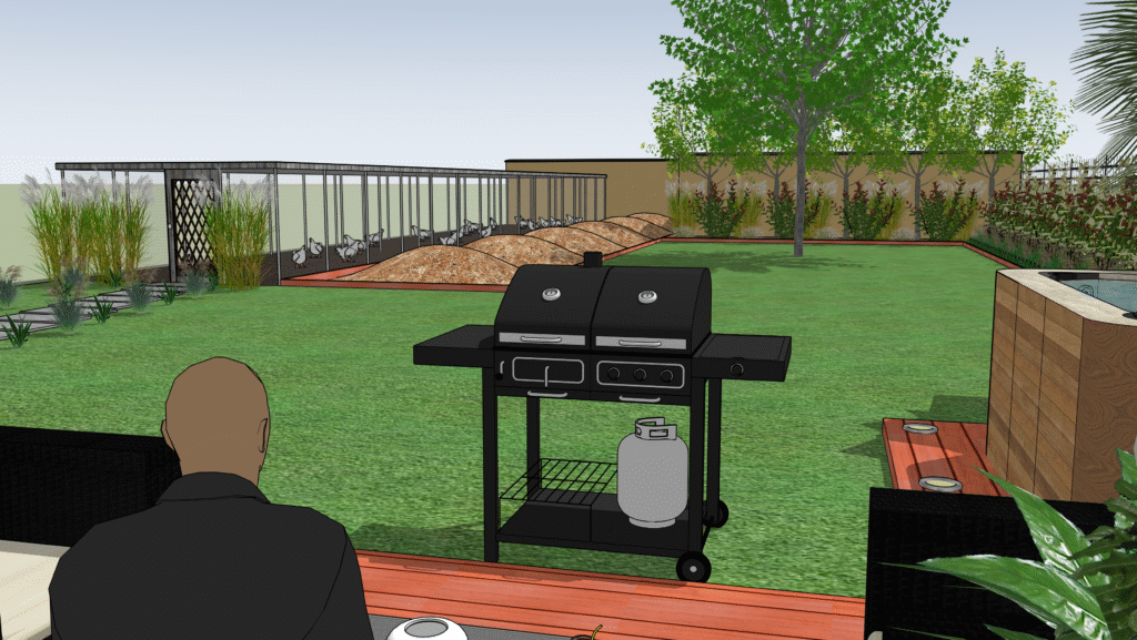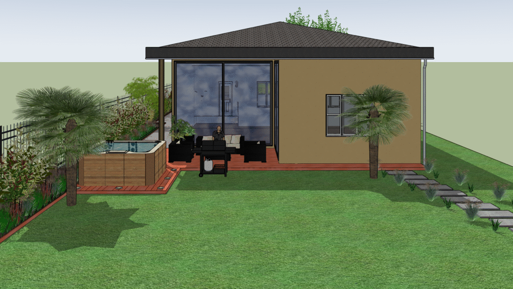 Chaque élément : stationnements latéraux, terrasse en bois exotique avec jacuzzi, arbre fruitier, potager et poulailler répondent aux besoins de confort, de convivialité et de durabilité des propriétaires. L’ensemble constitue un jardin cohérent, lisible où fonctionnalité et autonomie alimentaire se conjuguent pour créer un espace extérieur harmonieux, pleinement intégré au bâti et en dialogue avec son environnement.