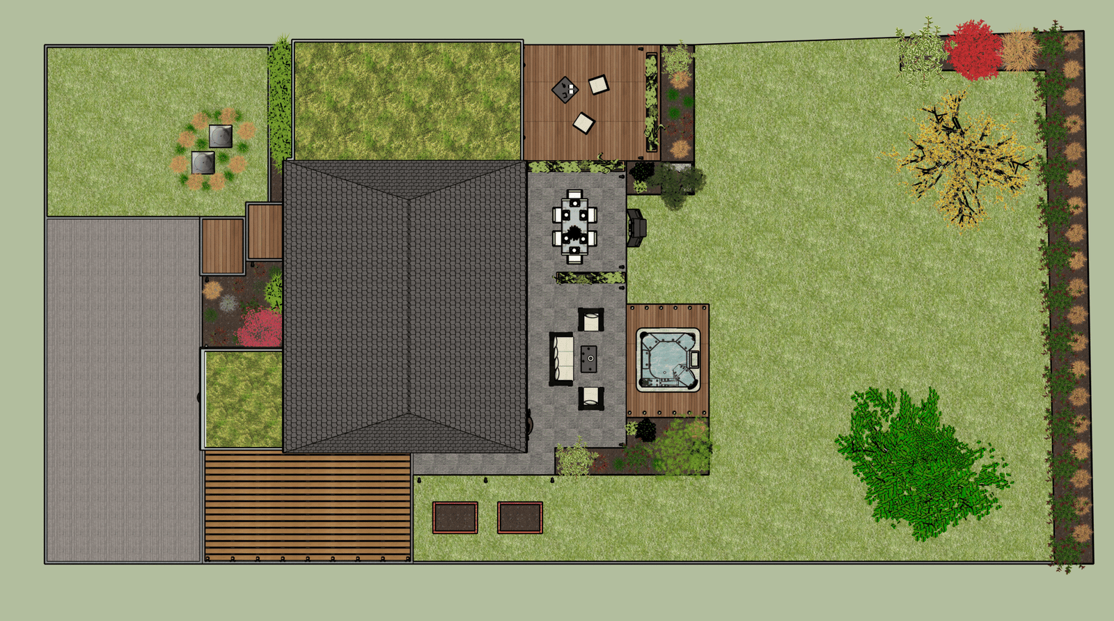 Pour le jardin : création d’un espace de vie extérieur, terrasse intégrant un jacuzzi, espace repas fonctionnel et zone intimiste correspondant à la terrasse parentale sur la gauche de la maison.