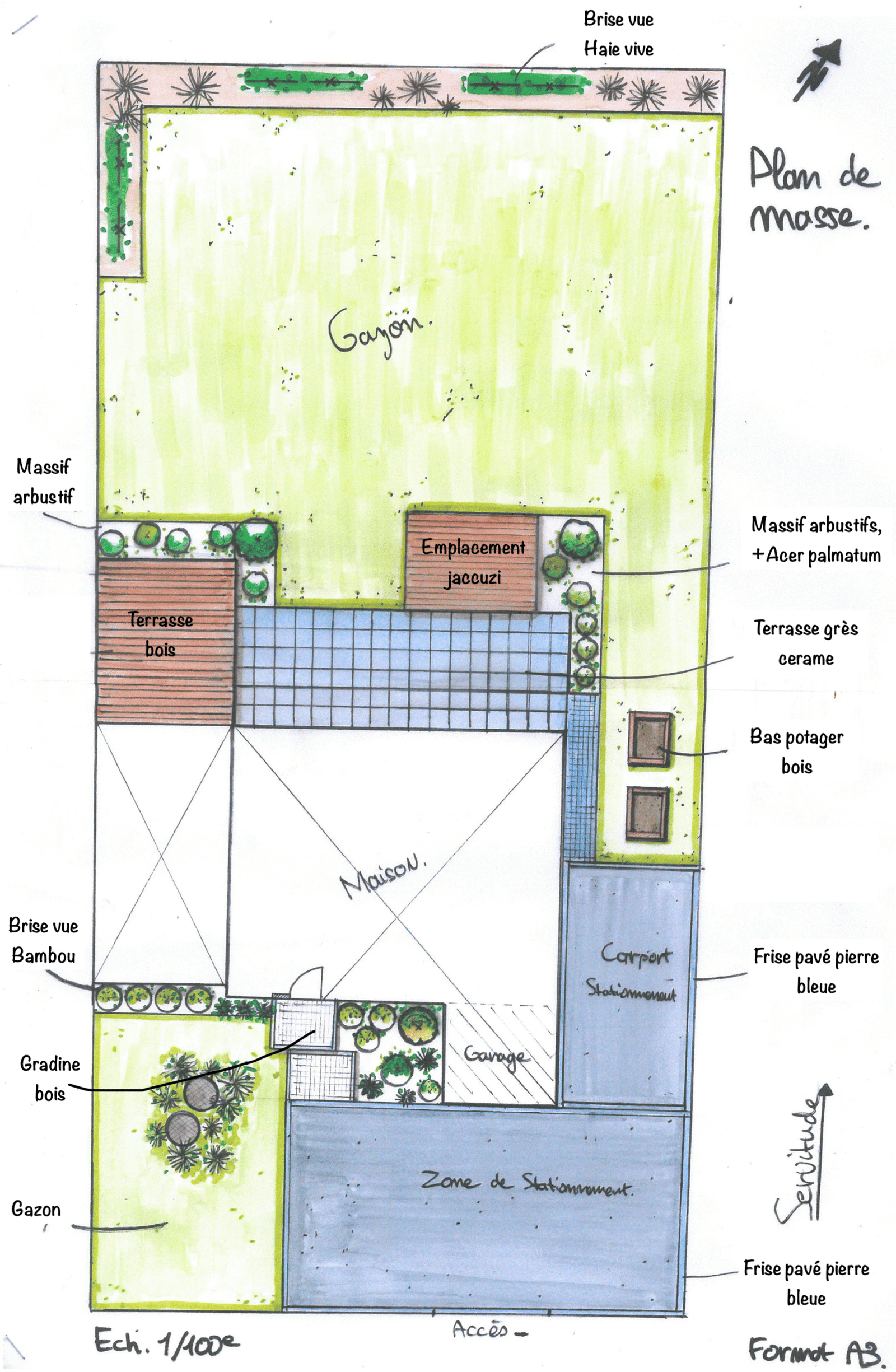 • Composition végétale ornementale : Accompagne le palier d’entrée avec couleurs et dynamisme, graminées hautes pour intégrer les éléments techniques et haie de bambou comme écran pour la baie vitrée.
