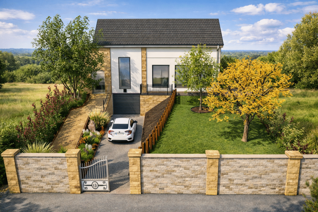Cheminement et traitement minéral : Allée d’entrée en béton sablé stabilisé, sobre et durable, améliorant lisibilité et articulation avec les niveaux de la maison.