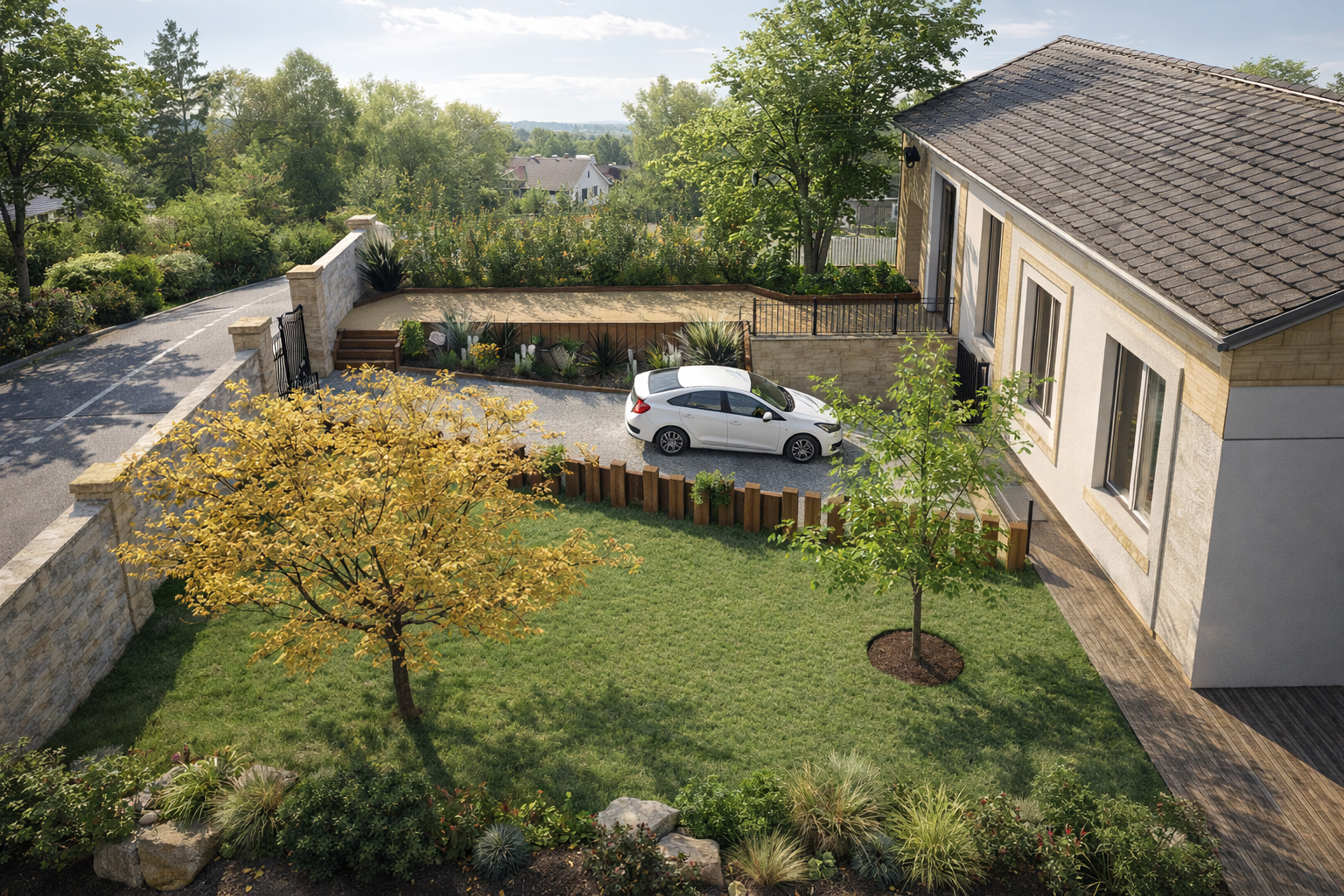 Ce projet s’inscrit dans la demande d’un particulier souhaitant redonner une identité claire et soignée à l’entrée de sa maison. L’existant présentait une descente de garage encadrée de deux talus abrupts et peu valorisés, ainsi qu’un cheminement vieillissant manquant de lisibilité.