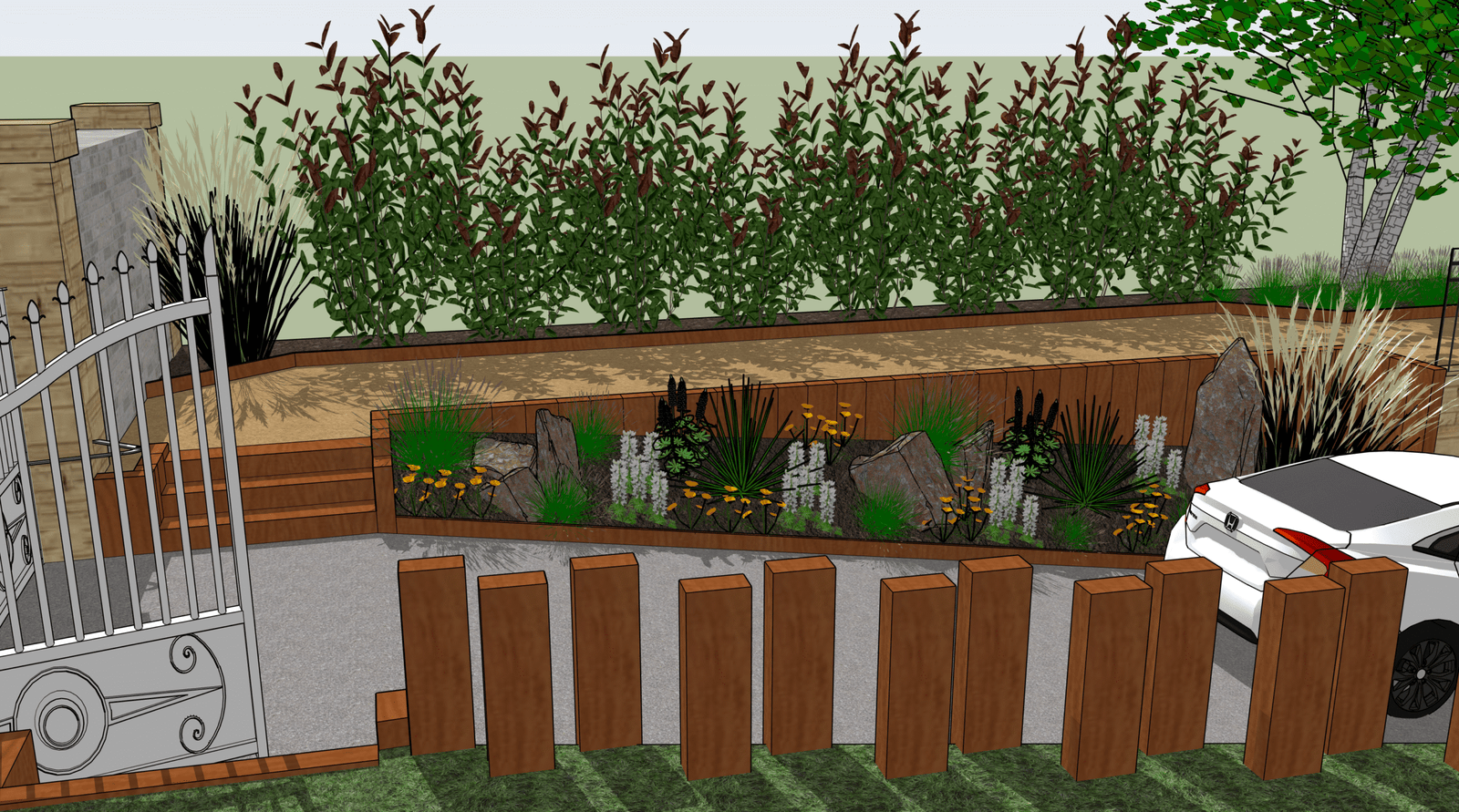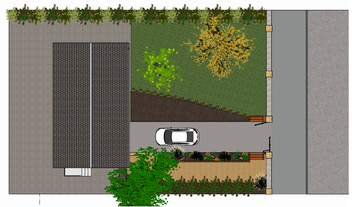 Massifs et végétation pérenne : mêlant roches et plantations de rocaille pérennes, faciles d’entretien, stabilisant les pentes et offrant une perspective végétale sobre, chaleureuse et durable habillant la descente de garage. Haie vive et petites plantations accompagnant la déambulation jusqu’au porche.