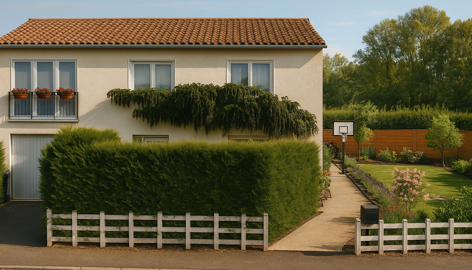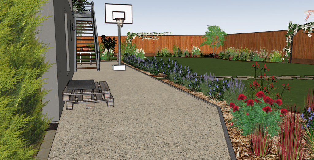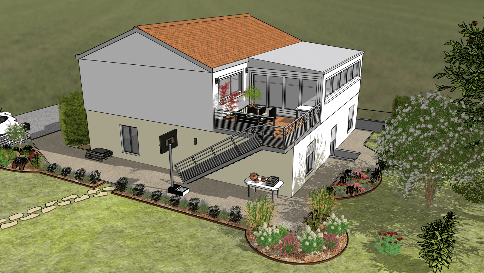 L’objectif était de rénover entièrement l’espace extérieur : remplacer la haie de thuyas vieillissante, requalifier le cheminement principal, créer des massifs paysagers, aménager un espace de tranquillité indépendant et intégrer une petite zone de production potagère et aromatique.
