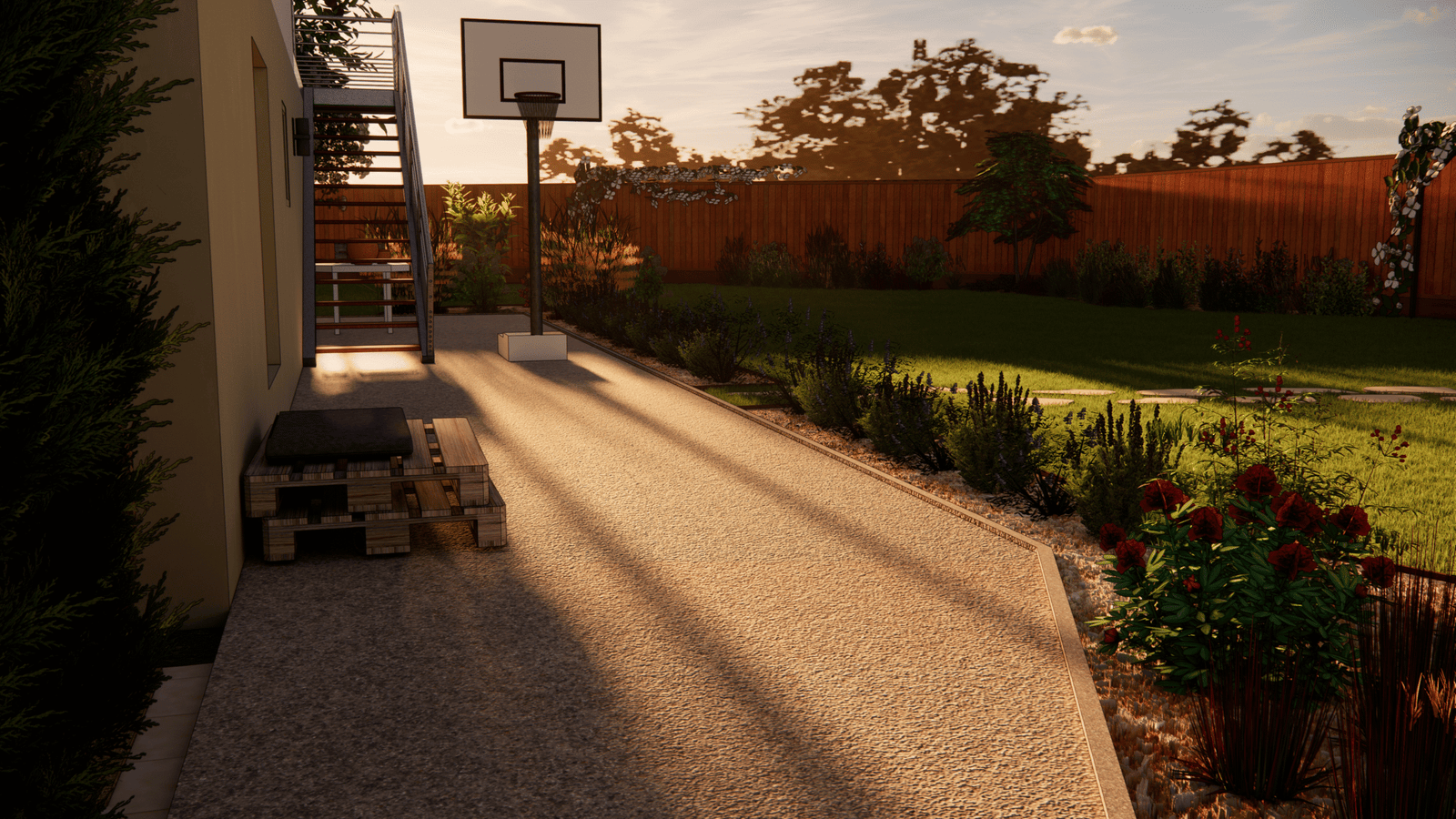 Cheminement principal : Béton désactivé inspiré des chemins de graviers, dans une teinte rappelant la pierre de Jaumont, emblématique de la région.